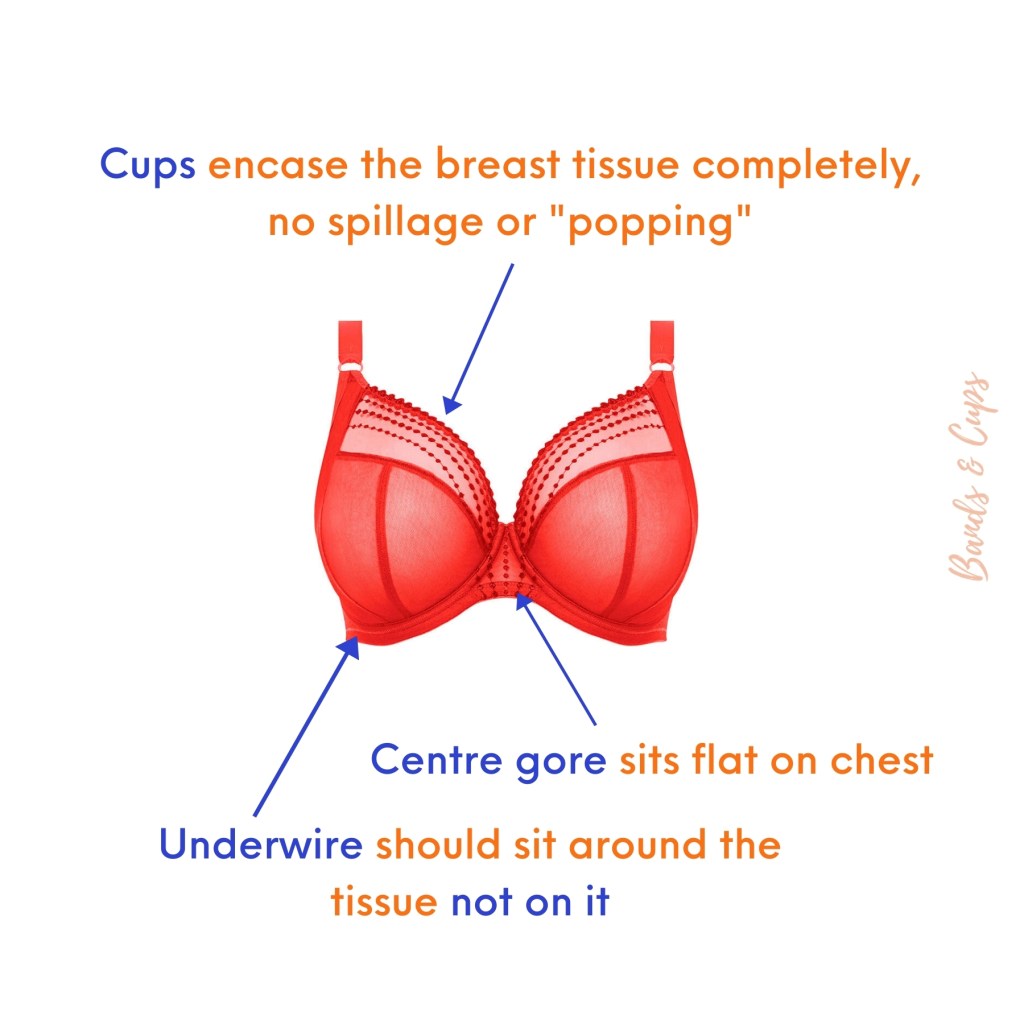 - The cups: The cups should encase your breast tissue well. There shouldn’t be any bulges from the top or the side. Most women find bras uncomfortable simply because they are in cups smaller than they should be. And because there isn’t enough room inside your bra, you either end up feeling all squished or spill out.