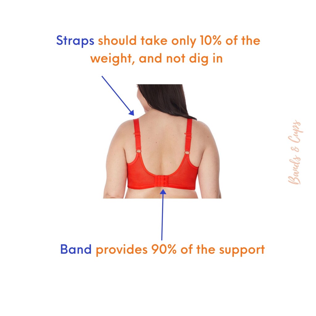 - The straps: Only 10% of the support needs to come from the shoulder straps. When the band is not as supportive as it should be, the shoulder straps end up overcompensating leaving the wearer with shoulder pain and a slouching posture.